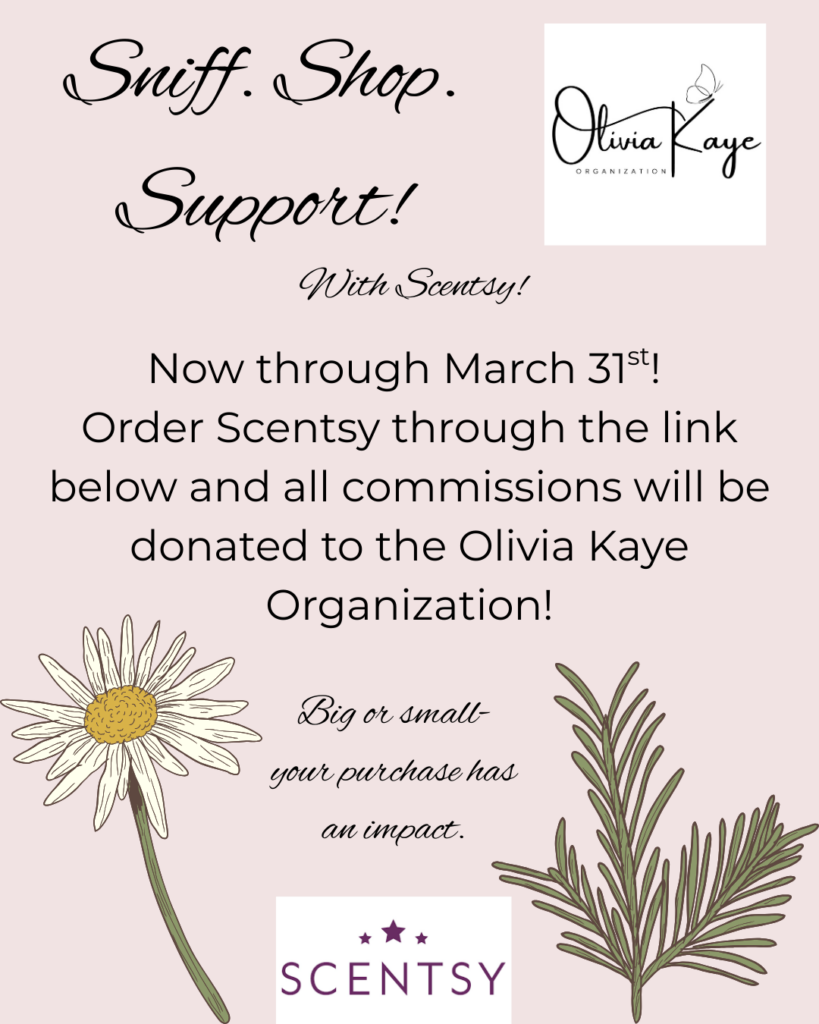 Now through March 31st, when you order Scentsy through the link below, all commissions will be donated to the Olivia Kaye Organization!